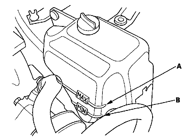 Coolant Check1. Look at the coolant level in the coolant reservoir. Make sure it is between the MAX mark (A) and MIN mark (B).