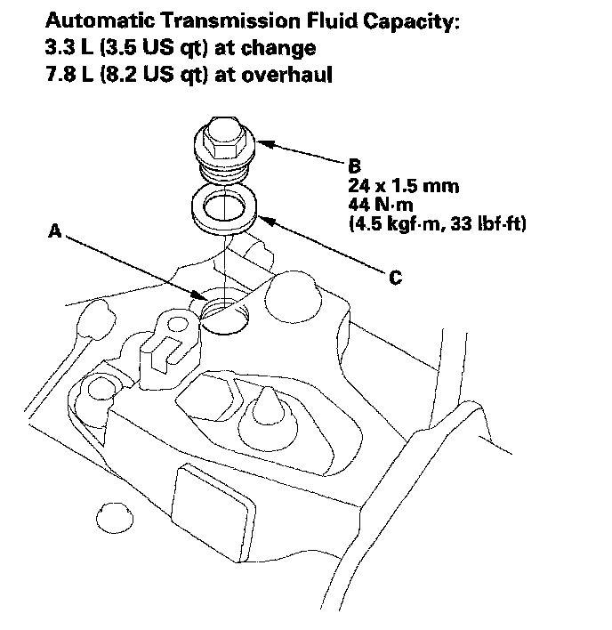 5. Refill the transmission with the recommended fluid into the filler hole (A). Always use Honda ATF DW-1 (ATF Z1 has been replaced by ATF DW-1, Honda Service News Nov 2010) Automatic Transmission Fluid (ATF). Using a non-Honda ATF can affect shift quality.