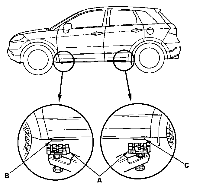 1. Position the lift blocks (A) under the vehicle's front support points (B) and rear support points (C).