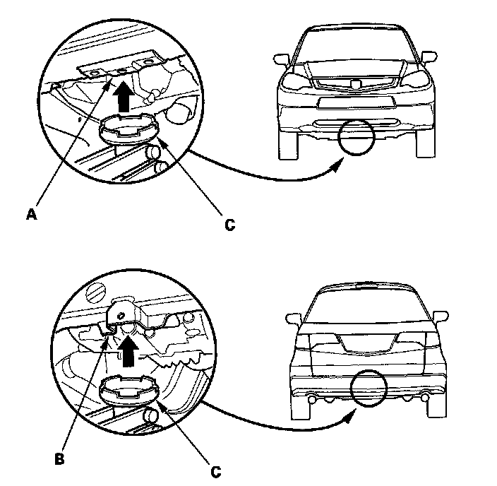 3. Position the floor jack under the front jacking bracket (A) or the rear jacking bracket (B). Center the jacking bracket on the jack lift platform (C), and jack up the vehicle high enough to fit the safety stands under it.