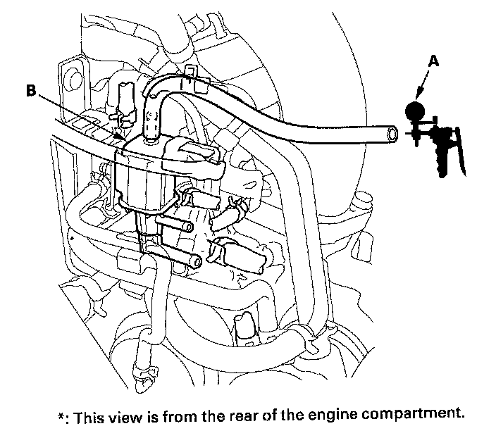 8. Connect the vacuum pump/gauge, 0-30 in.Hg (A) to the turbocharger boost control solenoid valve (B) as shown.