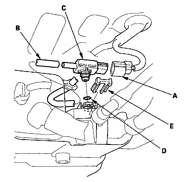 3. Reinstall the parts in the reverse order of removal with a new O-ring (D) and a new retainer (E).