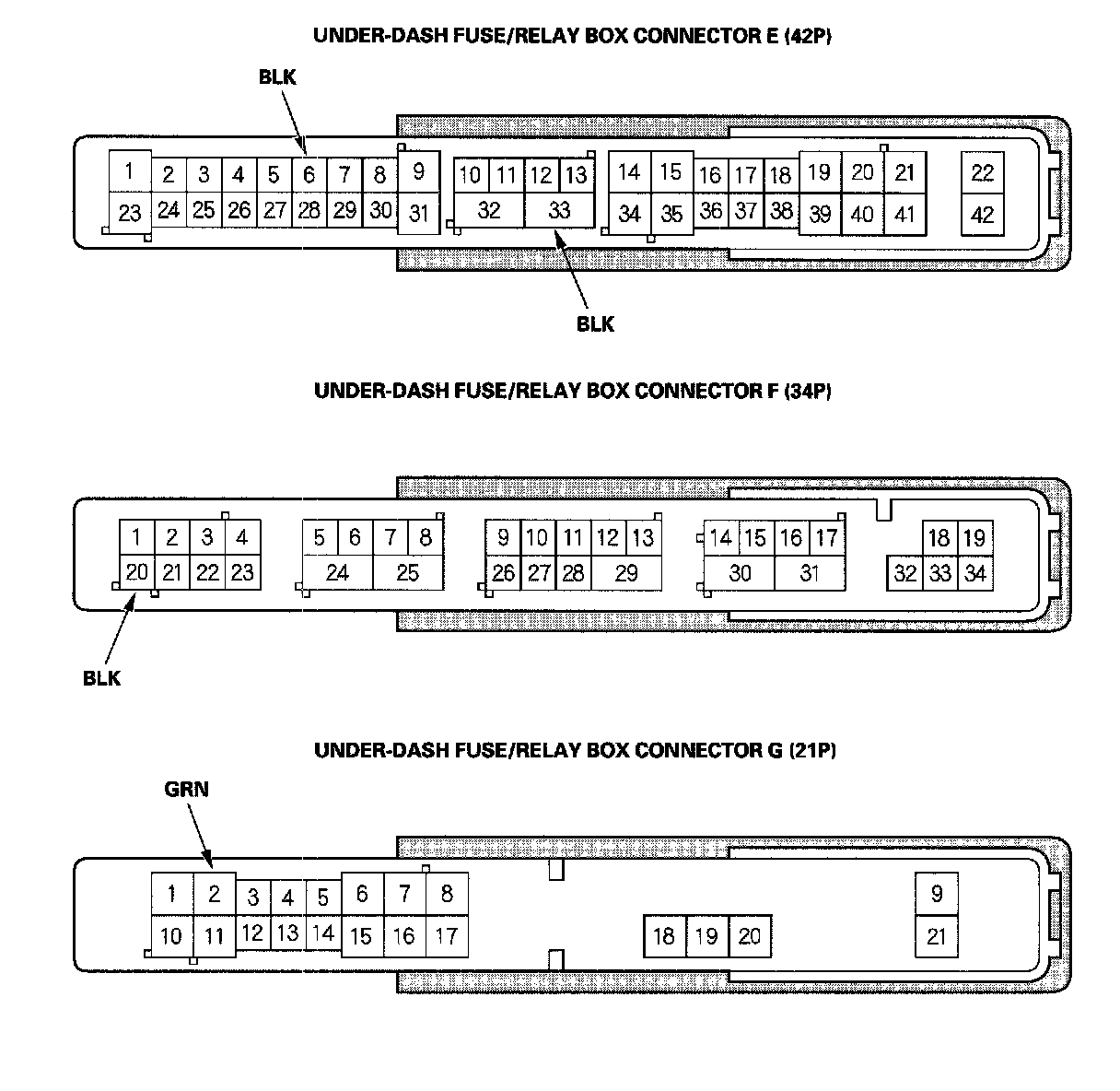 3. Disconnect the under-dash fuse/relay box connectors E, F, G, K, and T.