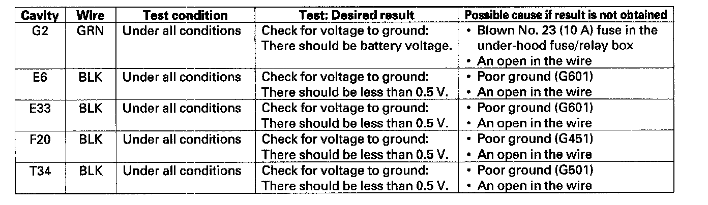 6. Reconnect the connectors to the underdash fuse/relay box, and make these input tests at the connectors.