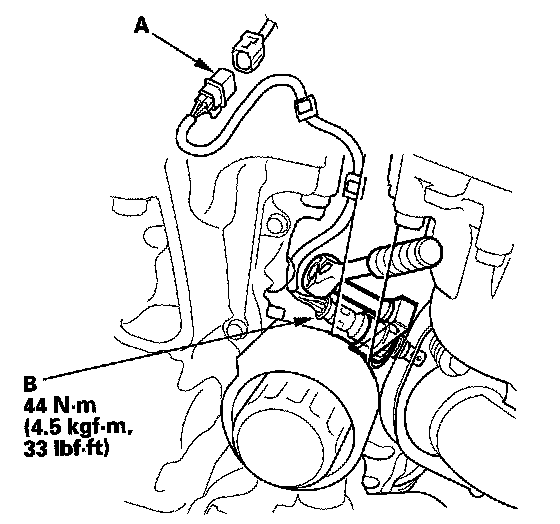 2. Disconnect the secondary HO2S 4P connector (A), then remove the secondary HO2S (B).
