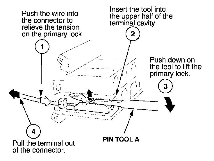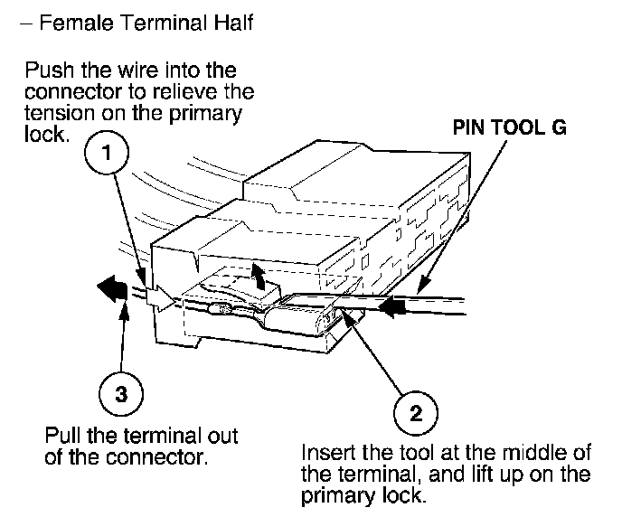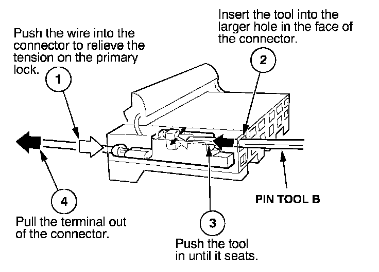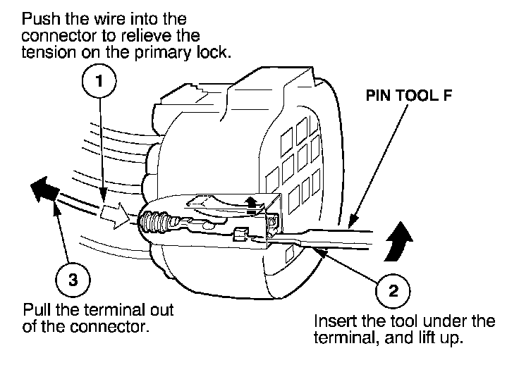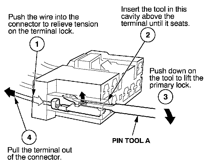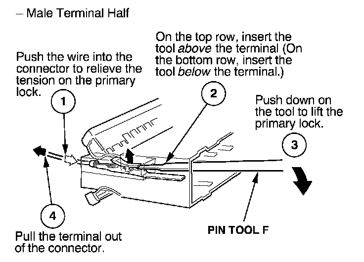 Before you begin, inspect the wire you are about to repair for damage and length. Make sure the wire will be long enough to make a terminal repair without stretching it when you reinstall the terminal in the connector. If the wire is too short, or if access to the connector is too restricted to make a terminal repair, you may need to install a pigtail terminal (a short length of wire with a factory-crimped terminal on it). Refer to HOW TO INSTALL PIGTAIL TERMINALS.