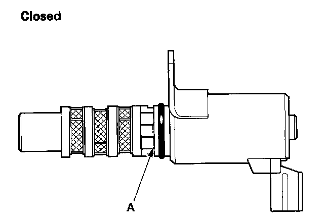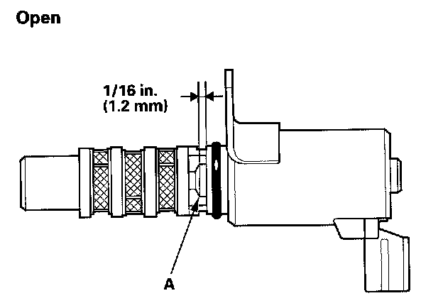 6. Connect the battery negative terminal to VTC oil control solenoid valve 2P connector terminal No. 1. Appearance of inner valve (A) in the port should be at least 1/16 in. (1.2 mm). If the inner valve does not open, replace it; then go to step 7.
