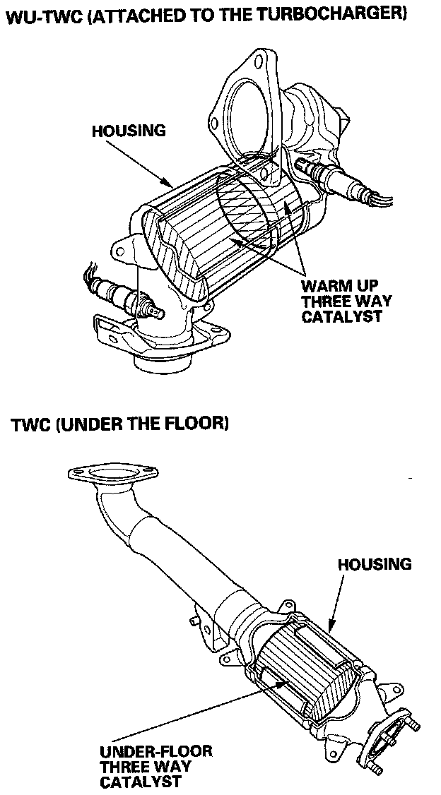 The WU-TWC/TWC converts hydrocarbons (HC), carbon monoxide (CO), and oxides of nitrogen (NOx) in the exhaust gas to carbon dioxide (CO2), nitrogen (N2), and water vapor.