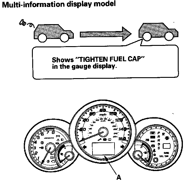 The first time a leak is detected a "TIGHTEN FUEL CAP" (multi-information display model) ("CHECK FUEL CAP" (information display model)) message in the gauge display (A). To scroll to another message, press the select/reset button. The "TIGHTEN FUEL CAP" "CHECK FUEL CAP" message will appear each time you restart the engine until the system turns the message off. Turn the engine off then replace or tighten the fuel fill cap until it clicks at least once. The message should go off after several days of normal driving after the fuel fill cap has been tightened or replaced.