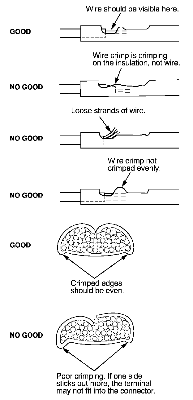 8. Inspect the quality of the wire crimp. If it has any of the following NO GOOD crimps, cut it off and start over.