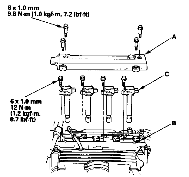 2. Remove the ignition coil cover (A), disconnect the ignition coil connectors (B), then remove the ignition coils (C).