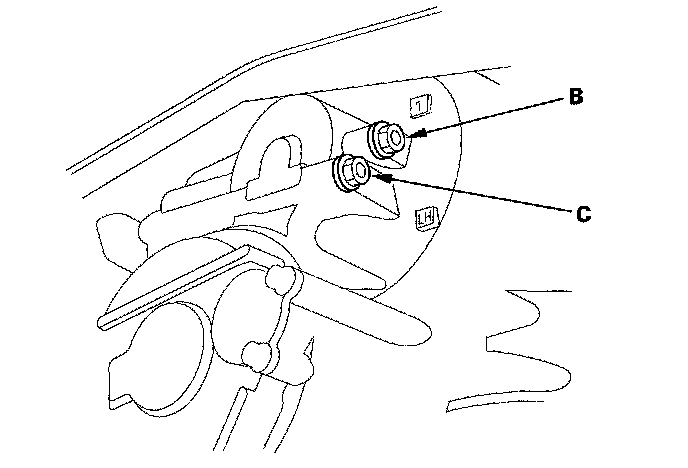 14. Shift into 1st gear by pulling the paddle shifter + (upshift switch), and measure the 1st clutch pressure at the 1st clutch pressure inspection port (B) and 1st-hold clutch pressure at the 1st-hold clutch pressure inspection port (C) while holding the engine speed at 2,000 rpm.