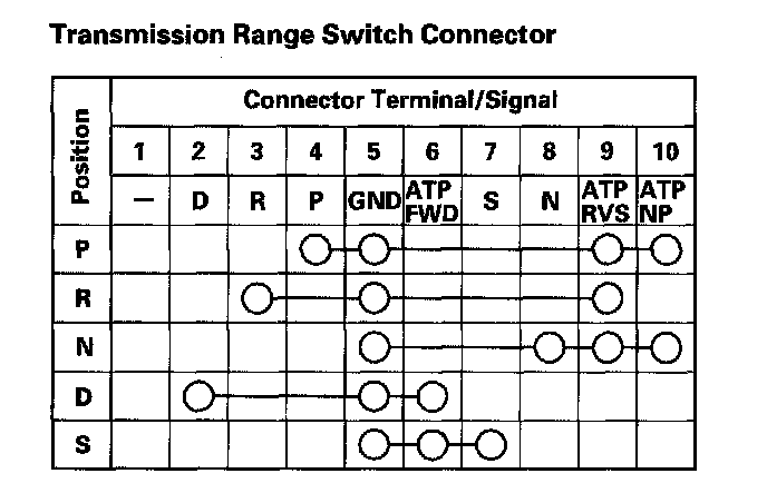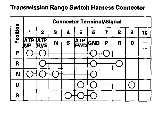 10. If the transmission range switch continuity check is OK, replace the faulty transmission range switch harness. If there is no continuity between any terminals, check the transmission range switch installation. If the switch installation is OK, replace the switch.