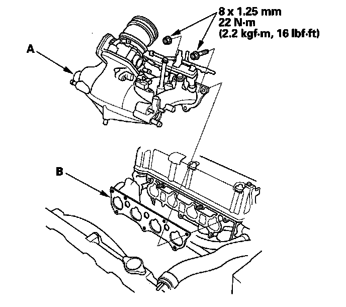 Install the intake manifold (A) with a new gasket (B), and tighten the bolts and nuts in a crisscross pattern in two or three steps, beginning with the inner bolt.
