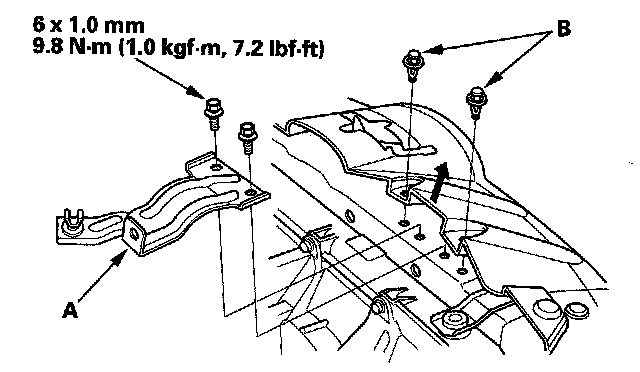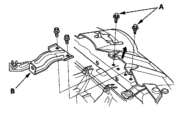 5. Remove the clips (A), then remove the support rod clamp bracket (B).