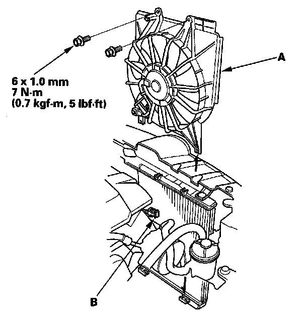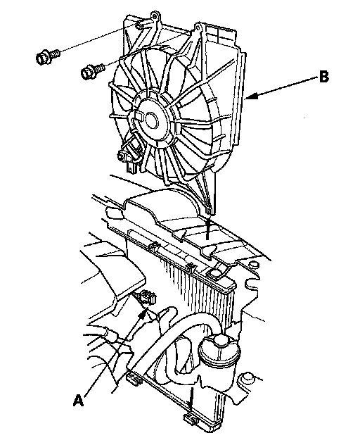 6. Disconnect the A/C condenser fan motor connector (A), then remove the A/C condenser fan shroud assembly (B).