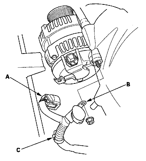 7. Disconnect the alternator connector (A) and BLK wire (B), then remove the harness clamp (C) from the alternator.