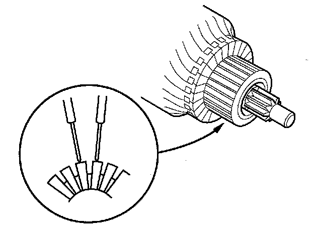 8. Check for continuity between the segments of the commutator. If there is an open circuit between any of the segments, replace the armature.