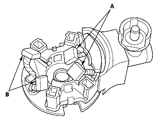 12. Check for continuity between the (+) brush (A) and (-) brush (B). If there is continuity, replace the brush holder assembly.