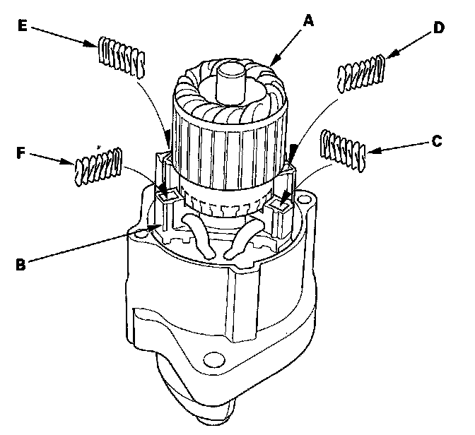 18. While squeezing a spring (C), insert it in the hole on the brush holder, and push it until it bottoms. Repeat this for the other three springs (D, E, and F).