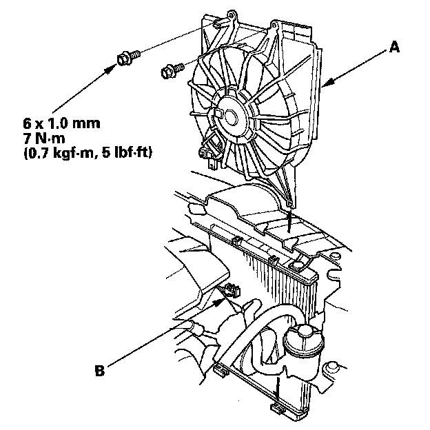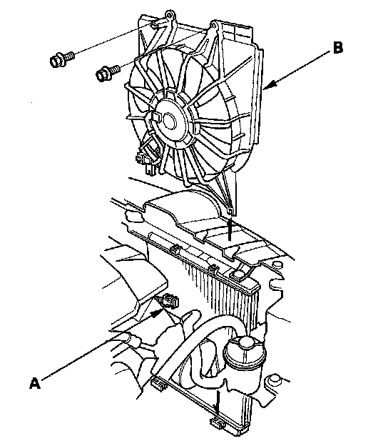 5. Disconnect the A/C condenser fan motor connector (A), then remove the A/C condenser fan shroud assembly (B).