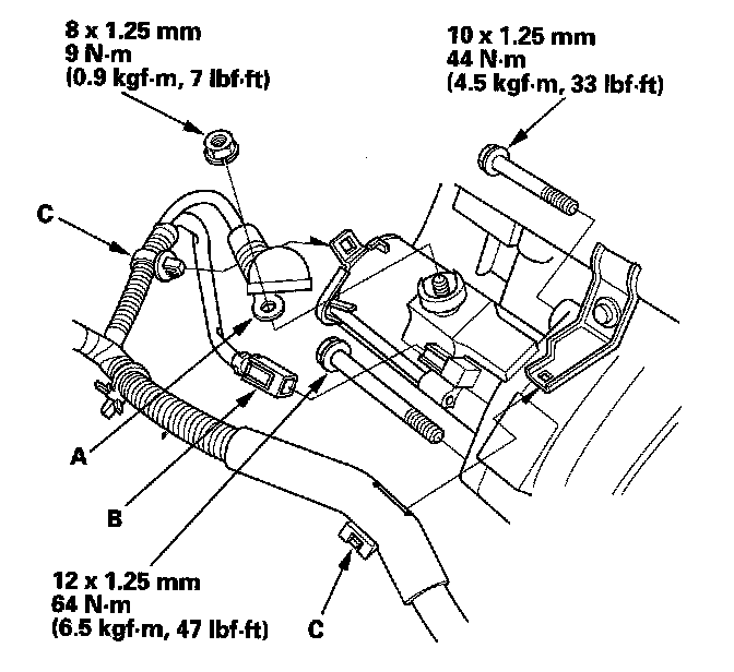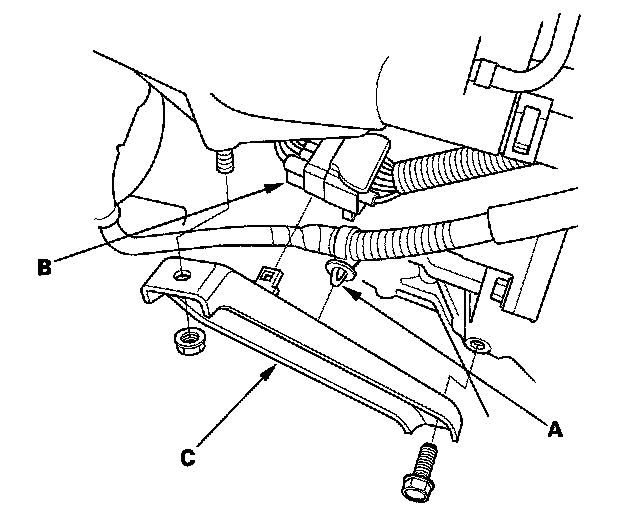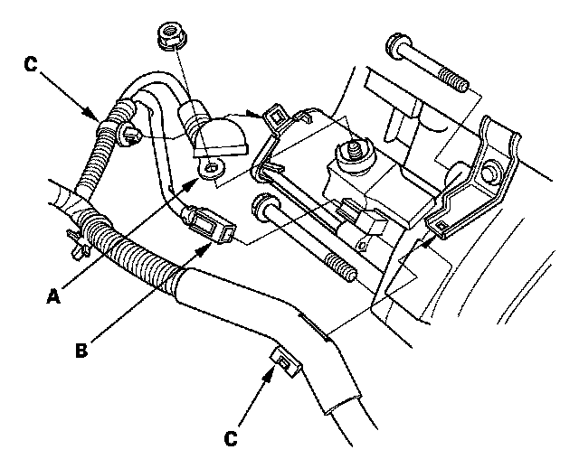 6. Remove the harness clamp (A) and connector (B), then remove the intake manifold bracket (C).