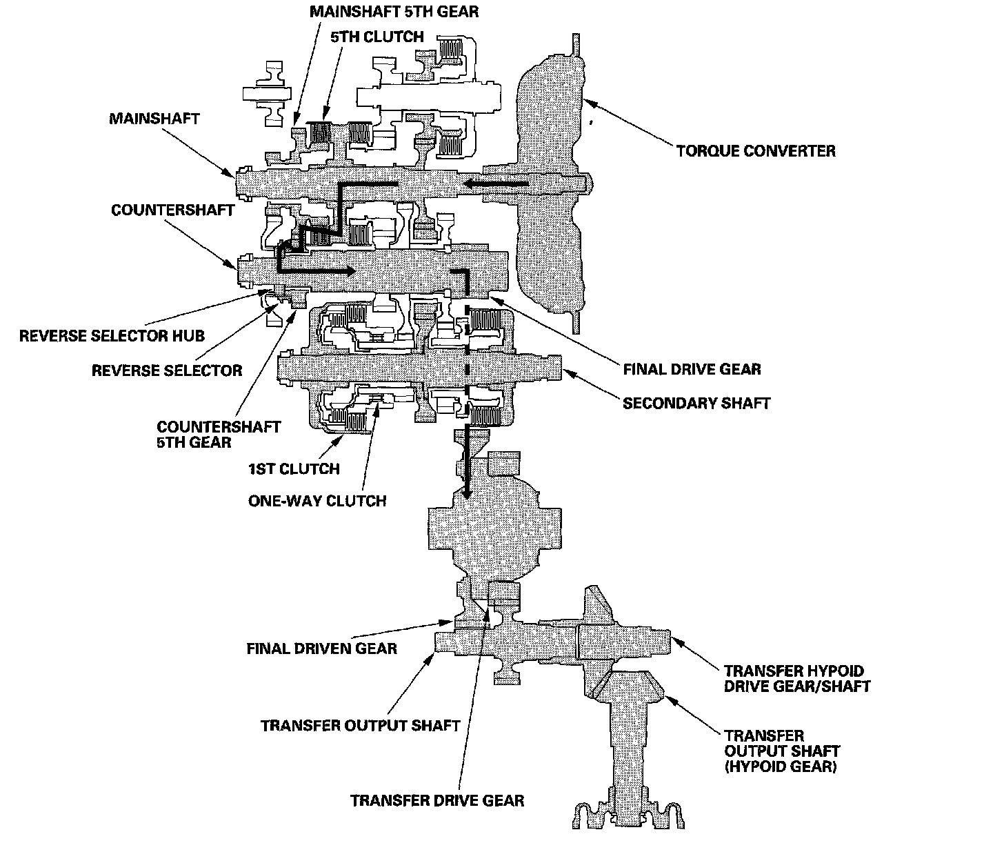 ^ Hydraulic pressure is applied to the 5th clutch, then the 5th clutch engages the mainshaft 5th gear with the mainshaft.