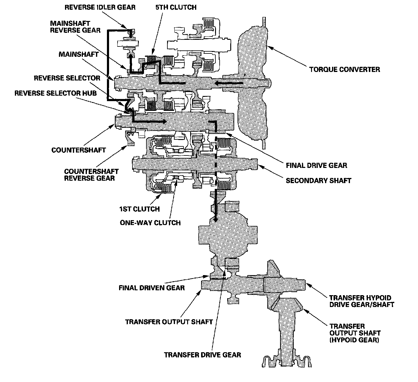 ^ Hydraulic pressure is applied to the 5th clutch, then the 5th clutch engages the mainshaft reverse gear with the mainshaft.