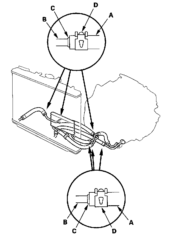 5. Slide the ATF cooler hoses (A) over the ATF cooler lines (B) until the hose ends contact with the bulge (C) of the ATF cooler lines, and secure the hoses with the clips (D) at appropriate points.