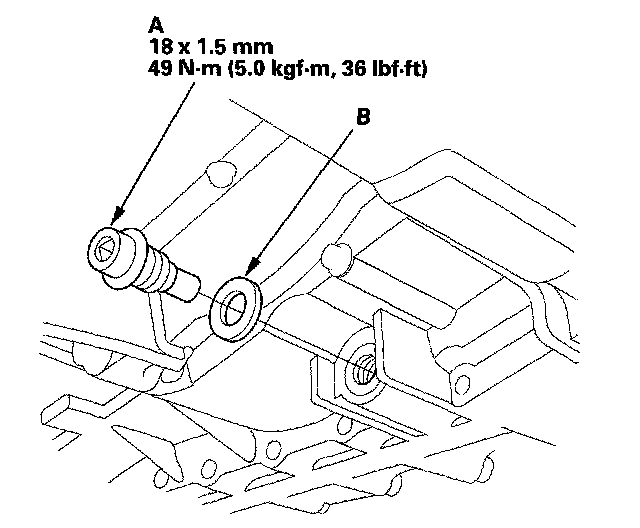 4. Reinstall the drain plug with a new sealing washer (B).