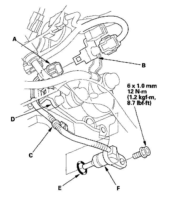 8. Install the new O-ring (E) on the new ATF temperature sensor (F), and install the ATF temperature sensor.
