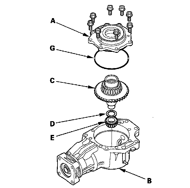 2. Remove the transfer hypoid drive gear/shaft assembly (C), 25 mm thrust shim (D), and tapered roller bearing (E).