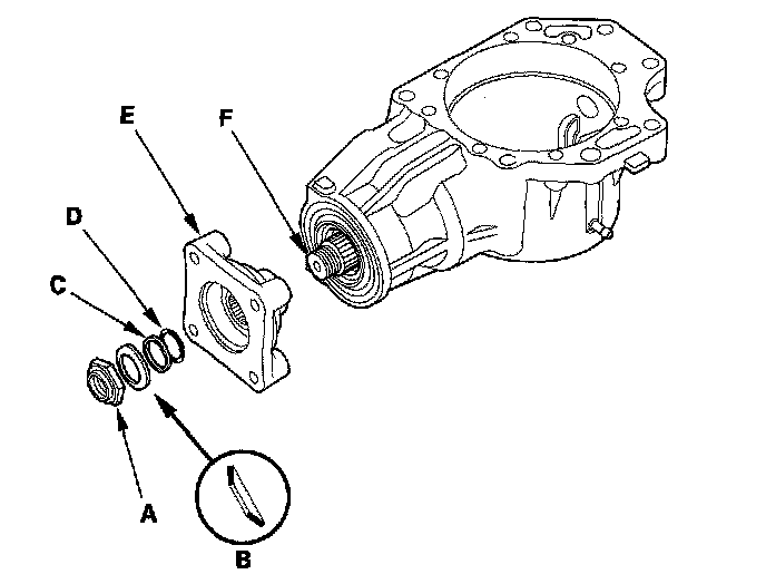 9. Remove the locknut (A), conical spring washer (B), back-up ring (C), O-ring (D), and companion flange (E) from the transfer output shaft (hypoid gear) (F).