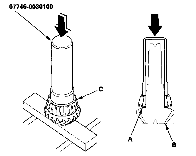 3. Install the 40 mm thrust shim (A) on the transfer output shaft (hypoid gear) (B), then install the tapered roller bearing (C) using the driver (40 mm I.D.) and the press.