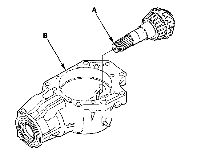 6. Install the transfer output shaft (hypoid gear) (A) in the transfer housing (B). Do not install the thrust washers and transfer spacer on the transfer output shaft.