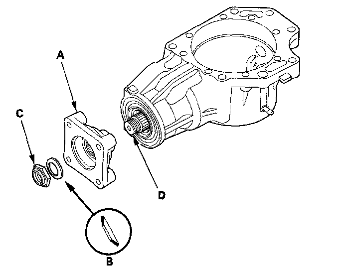 7. Install the companion flange (A), conical spring washer (B) in the direction shown, and locknut (C) on the transfer output shaft (hypoid gear) (D). Do not install the O-ring and back-up ring on the transfer output shaft.