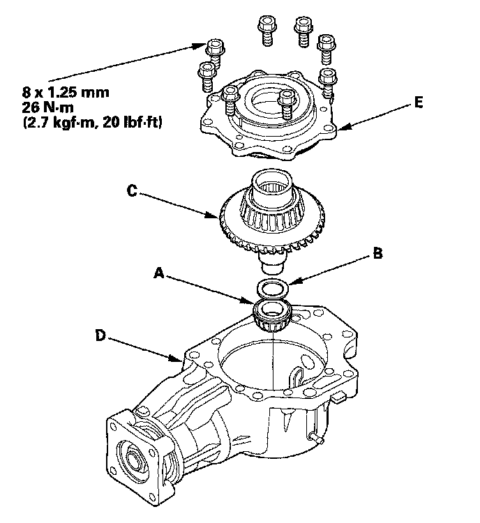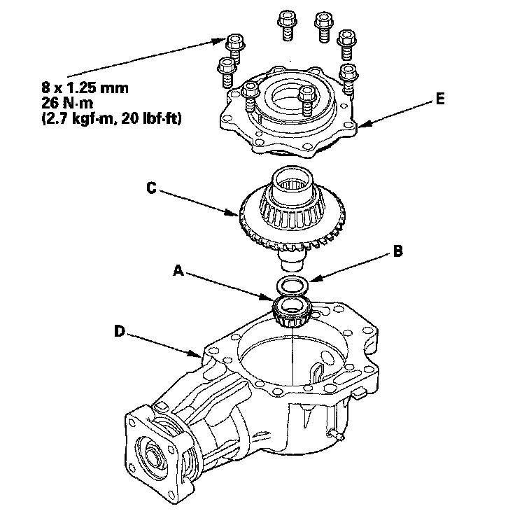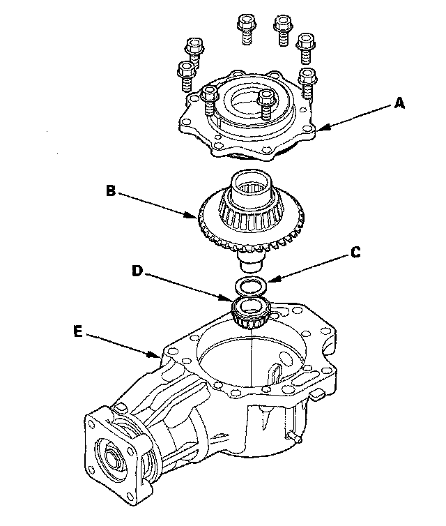 19. Remove the transfer cover (A), transfer hypoid drive gear/shaft assembly (B), 25 mm thrust shim (C), and tapered roller bearing (D) from the transfer housing (E) after adjusting the transfer gear backlash or transfer gear tooth contact.