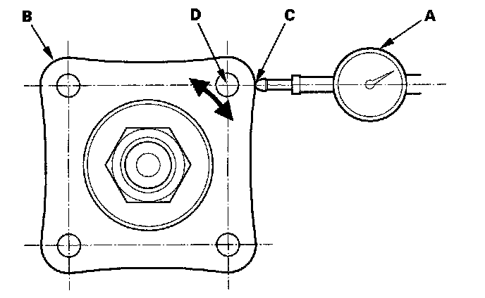14. Set a dial indicator (A) on the transfer companion flange (B); position dial indicator tip (C) on the direct extension of the bolt hole center (D).