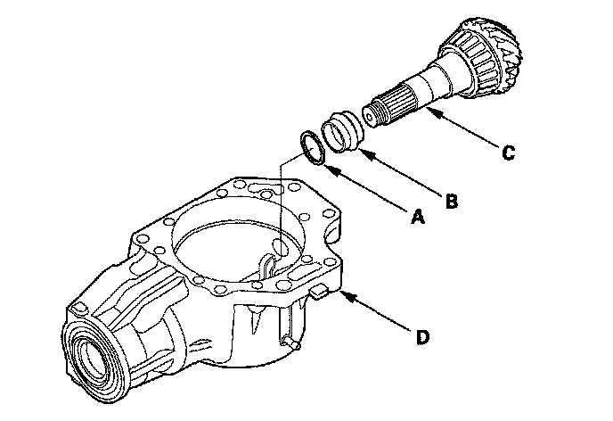 11. Install the tapered roller bearing (A), 25 mm thrust shim (B), and transfer hypoid drive gear/shaft assembly (C) in the transfer housing (D).