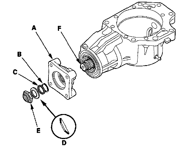 25. Install the companion flange (A), new O-ring (B), back-up ring (C), new conical spring washer (D), and new locknut (E) on the transfer output shaft (hypoid gear) (F). Install the conical spring washer in the direction shown.