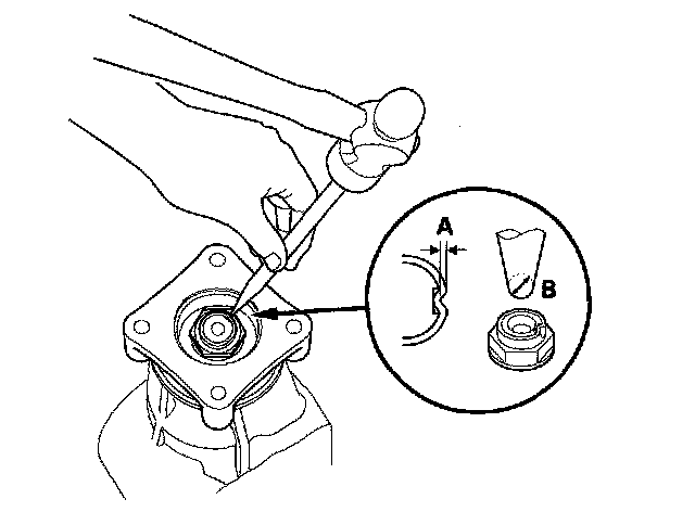 29. Stake the locknut to a depth (A) of 0.7-1.2 mm (0.03-0.05 in.) using a 3.5 mm punch (B).