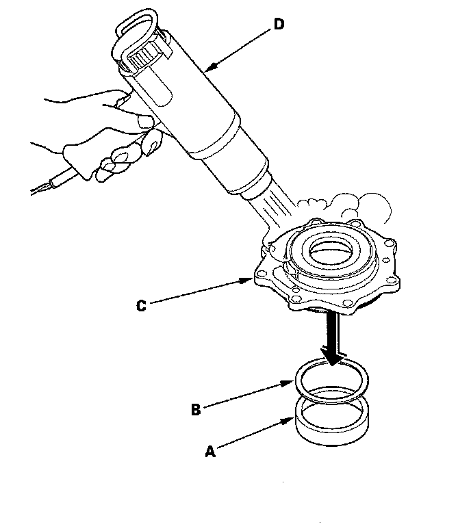 36. If the measurement is out of standard, remove the bearing outer race (A) and 80 mm thrust shim (B) from the transfer cover (C). If the bearing outer race is press-fitted, remove the bearing outer race by heating the cover to about 212° F (100° C) with a heat gun (D). Do not heat the cover more than 212° F (100° C).