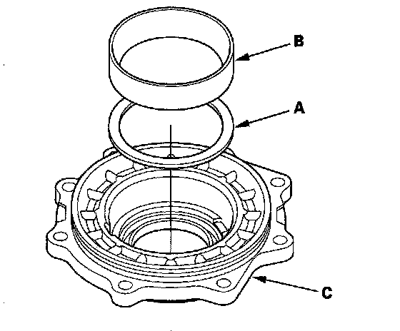 38. Install the 80 mm trust shim (A) and bearing outer race (B) in the transfer cover (C). If you heated the cover, let it cool to room temperature before installing the thrust shim.