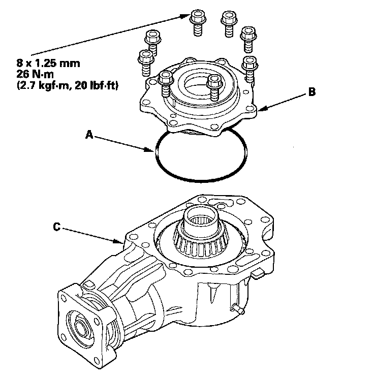 41. Install the new O-ring (A) on the transfer cover (B), then install the cover on the transfer housing (C).