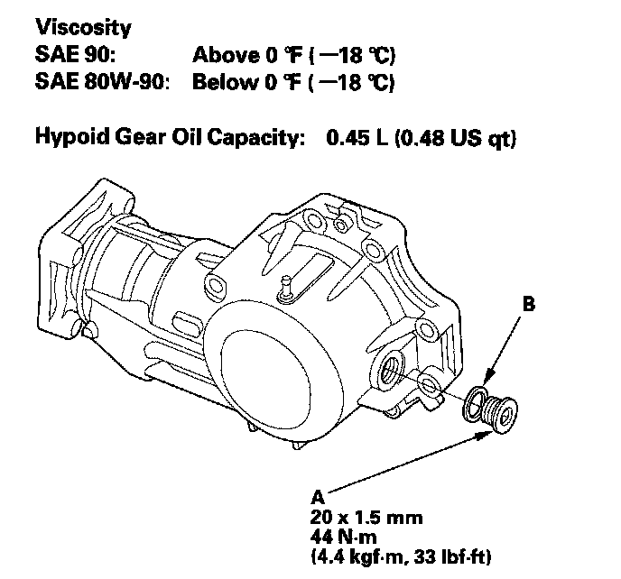 42. Remove the filler plug (A), then refill the transfer assembly with transfer fluid (hypoid gear oil). Use a SAE 90 or SAE 80W-90 viscosity hypoid gear oil, API classified GL4 or GL5 only.