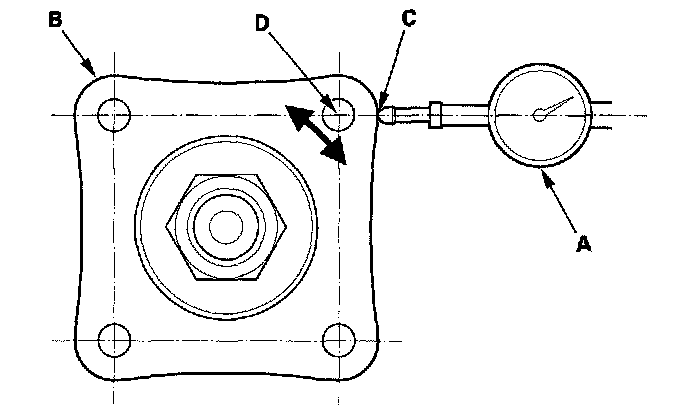5. Set a dial indicator (A) on the transfer companion flange (B); position dial indicator tip (C) on the direct extension of the bolt hole center (D).