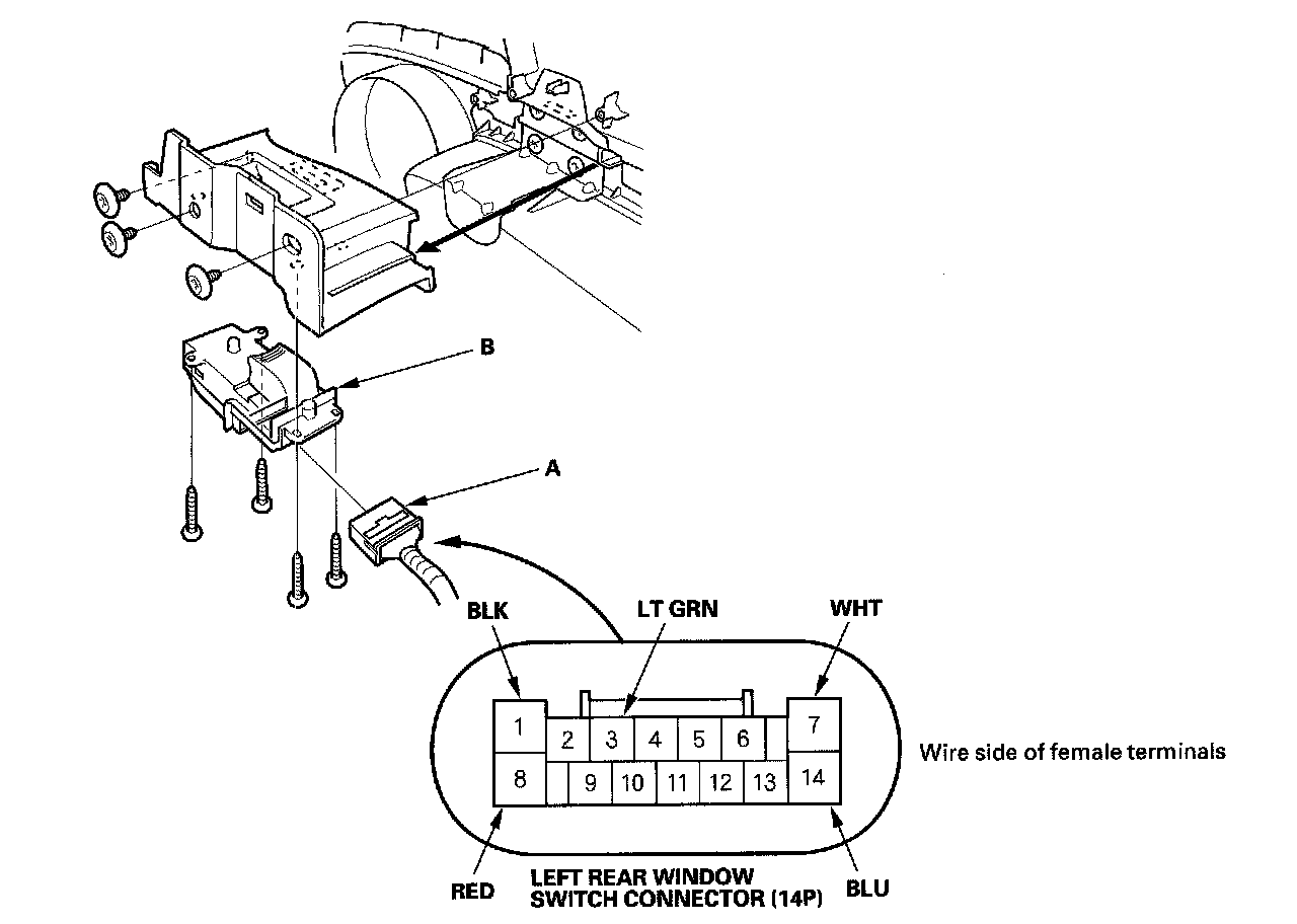 2. Disconnect the 14P connector (A) from the left rear power window switch (B).
