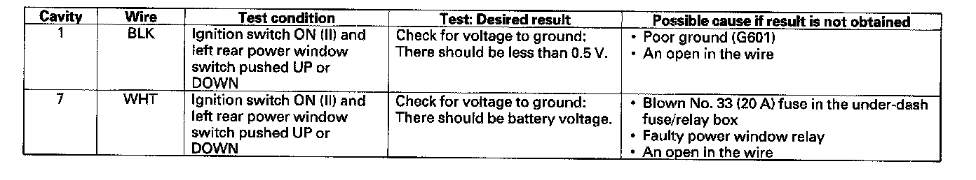 5. Reconnect the connector to the left rear power window switch, and make these input tests at the connector.
