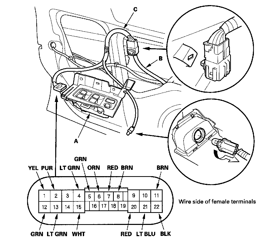 2. Reconnect the driver's door wire harness (B) to the driver's door subharness (C).
