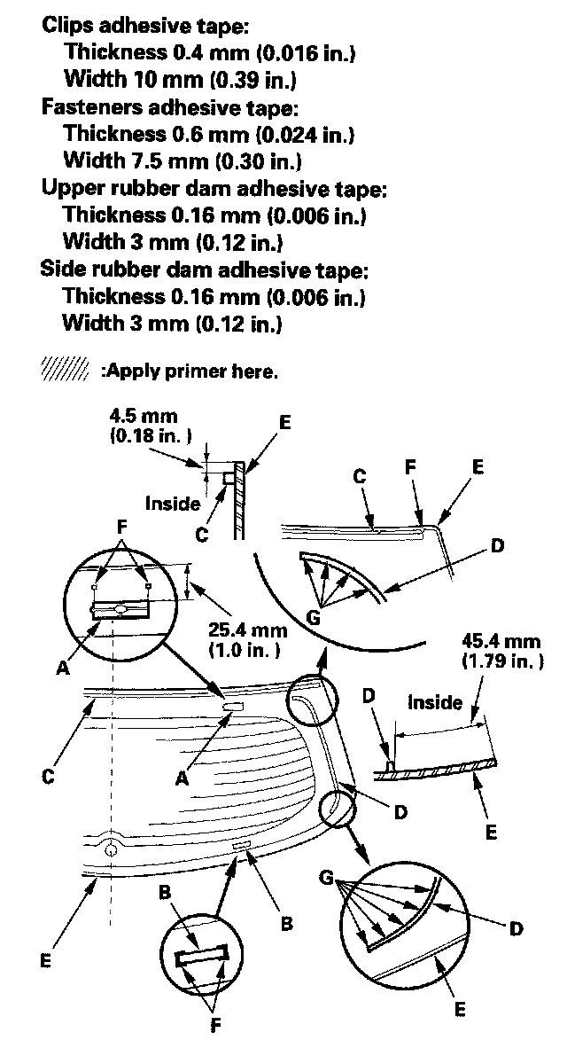 11. Attach the clips (A), fasteners (B), upper rubber dam (C), and side rubber dams (D) with adhesive tape to the inside face of the rear window (E) as shown. Before installing the upper and side rubber dams, apply primer to the inside face of the rear window.